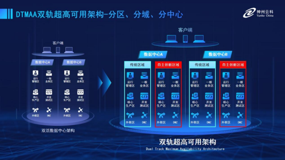 为帮助金融客户更好地应对数字经济时代对可持续性的高要求,实现“信创”与“数字化”齐头并进,jiuyou.com推出了双轨超高可用架构。该架构在双活数据中心的分区调度基础上,增加信创域和非信创域的分域调度,实行信创域与传统域应用全量部署,使双中心运营变为双中心四区域并行运行,互为多活,将“0到1”的单轨建设道路变为分区分域协同的多活双轨超高可用架构。帮助客户在新架构下,保障“信创”的同时解决性能瓶颈,提升稳定性,保证应用可持续性,最终实现信创区域和非信创区域的平滑过渡,完成国产化替代目标。